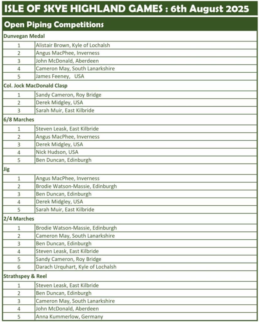 The Highland Society of London’s award for Champion Piper at the Isle of Skye Highland Games 2025 was won by Angus MacPhee, Inverness. The winners and runners-up of the individual competitions held over the two days were as listed below.