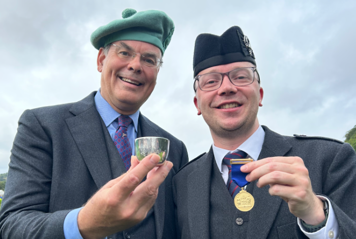 Duncan Byatt (President of the Highland Society of London) presents Gold Medal winner Steven Leask with a silver tumbler cup to commemorate the 150th anniversary of the competition.